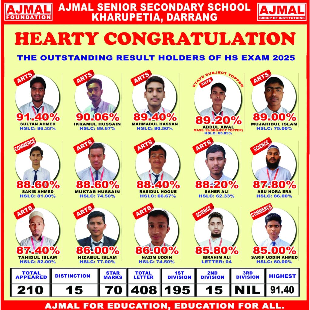 Congratulations to the outstanding performers of the Higher Secondary (H.S.) Examination 2025! Ajmal Senior Secondary School, Kharupetia, under the aegis of the Ajmal Group of Institutions, is immensely proud of the stellar achievements of its students across the Arts, Science, and Commerce streams. Leading the way is Sultan Ahmed (Arts) with an impressive 91.40%, followed closely by Ikramul Hussain at 90.06% and Mahmadul Hassan at 89.40%. We also celebrate Abdul Awal, the State Subject Topper in Arts with 89.20%, and top scorers in Science and Commerce like Ibrahim Ali (85.80%) and Sakib Ahmed (88.60%). These results are a testament to the dedication of our students and the unwavering support of the Ajmal Foundation in fostering academic excellence.